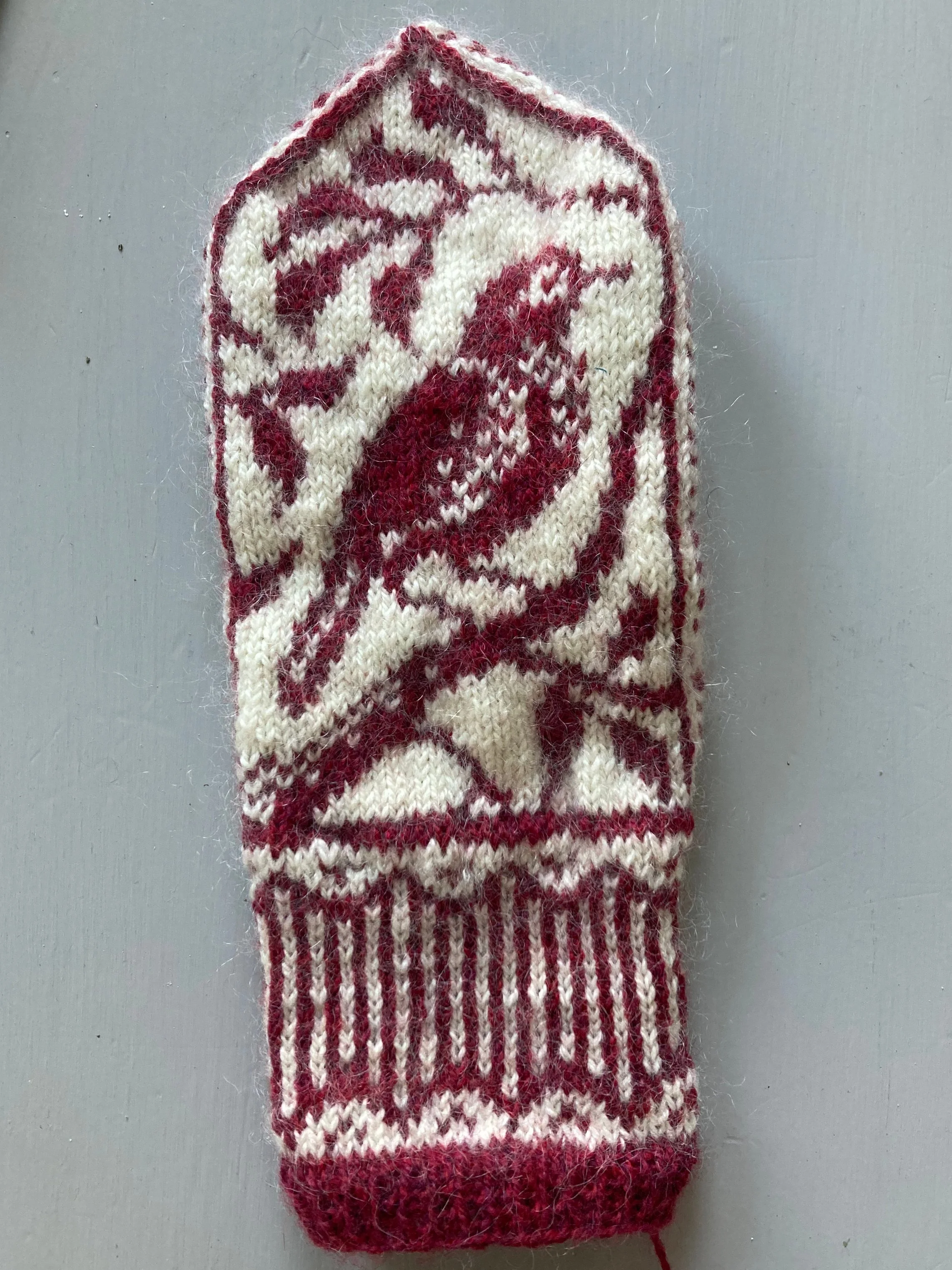 Completed a single mitten (pattern here, Songbird Mittens by Erica Heusser). The thumb was so annoying that I quit for a while, but I’m being so brave and cast on the right hand a week or so ago. Should be quicker to finish this one now that I know what I’m doing! I’ll be honest, I don’t looove the cuff so tested out a technique that rips back to the cast-on edge but it shifts the vertical stripes a bit and I decided too long was better than twisted. I haven’t blocked this yet, I’m hoping the slight puckering in the fabric relaxes a bit once I do.