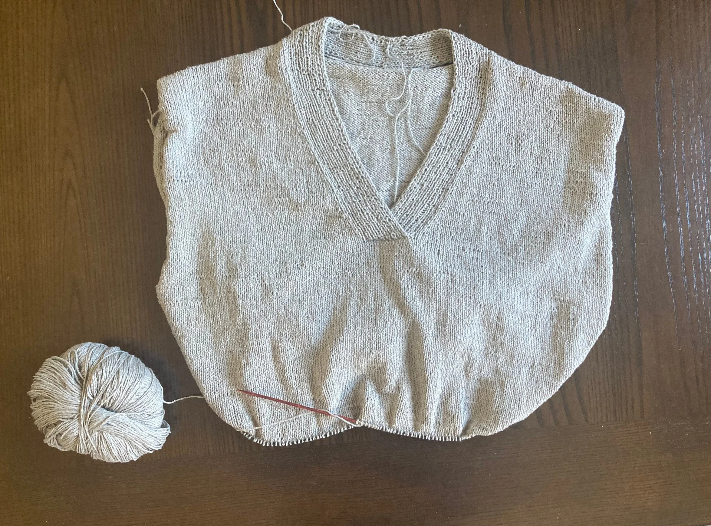 pattern uses a brand new style of construction for me! you work the top of the back panel first and then down towards the vneck from the shoulders. until you join at the neck it doesn’t have the “try as you go” ability of most top down patterns which is a bummer but fun to see all the different ways a garment can come together.